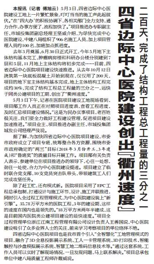 5月11日,衢州日?qǐng)?bào)在頭版重要位置刊登了集團(tuán)作為業(yè)主單位承建的四省邊際中心醫(yī)院建設(shè)進(jìn)展,對(duì)醫(yī)院實(shí)行專班制推進(jìn)、建設(shè)模式創(chuàng)新、智慧化工地管理等方面給予高度評(píng)價(jià),現(xiàn)予以轉(zhuǎn)載。